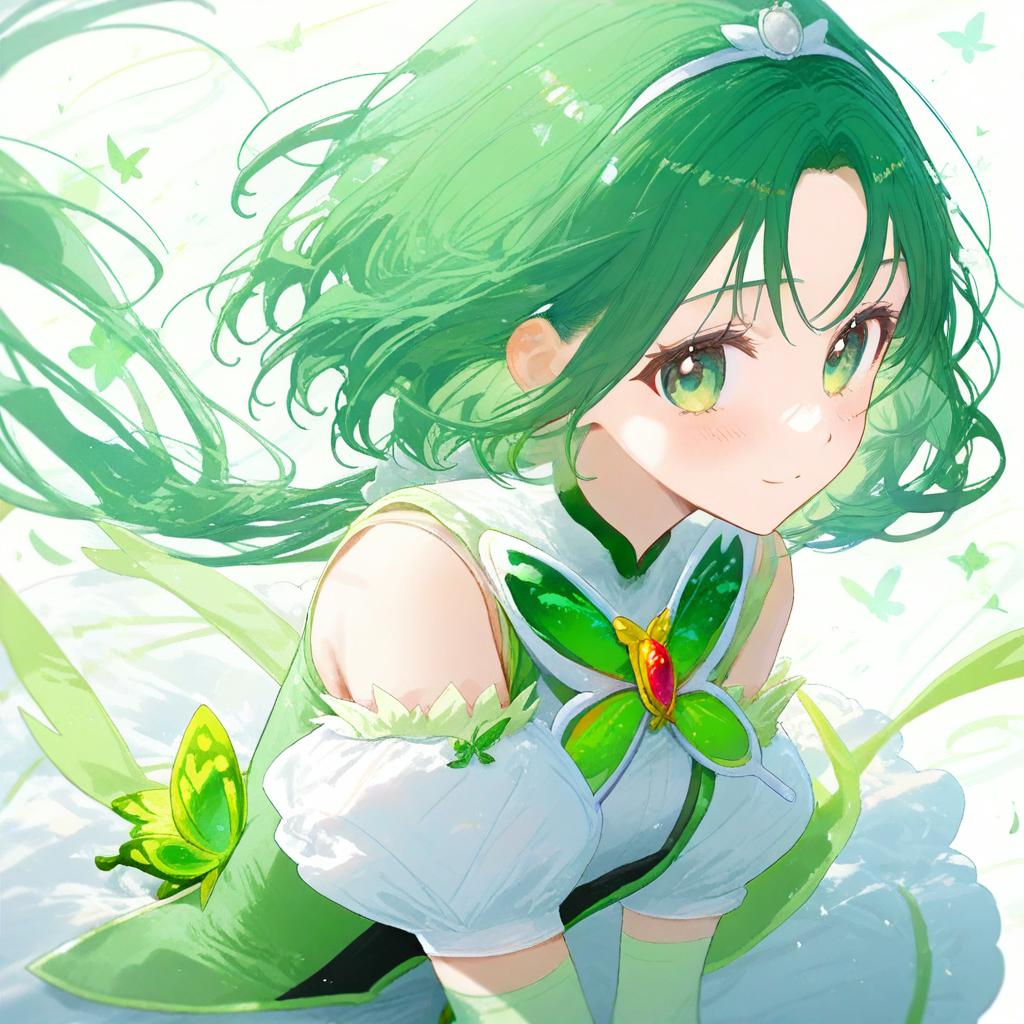 Digital illustration of a magical girl character with vibrant green hair and green eyes. She is wearing a white and green magical girl costume adorned with a large butterfly brooch featuring a red gem. The background is light with floating butterfly motifs, emphasizing a whimsical and enchanting theme. The character has soft facial features with a gentle expression and is depicted in anime style artwork.