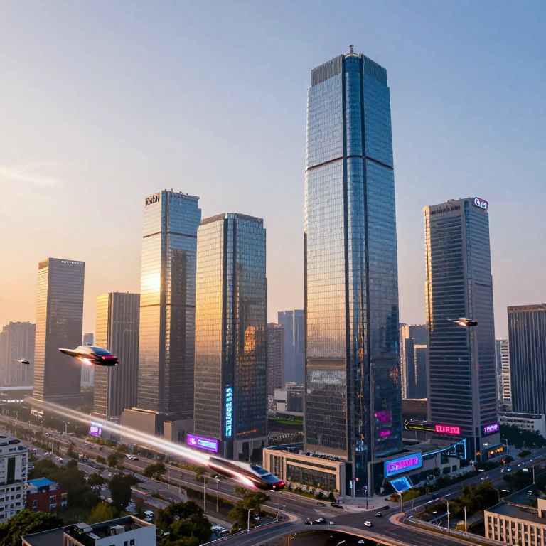 Photograph of a nighttime urban cityscape featuring tall, modern skyscrapers with illuminated blue, pink, and white lights. The central building has a large, vibrant pink and blue digital screen. A helicopter with red lights hovers in the dark sky above. Street lights and trees are visible at the bottom, creating a contrast with the towering buildings. The sky is a deep blue, enhancing the city's bright lights. The buildings have sleek, reflective glass facades, adding to the modern, bustling city atmosphere.