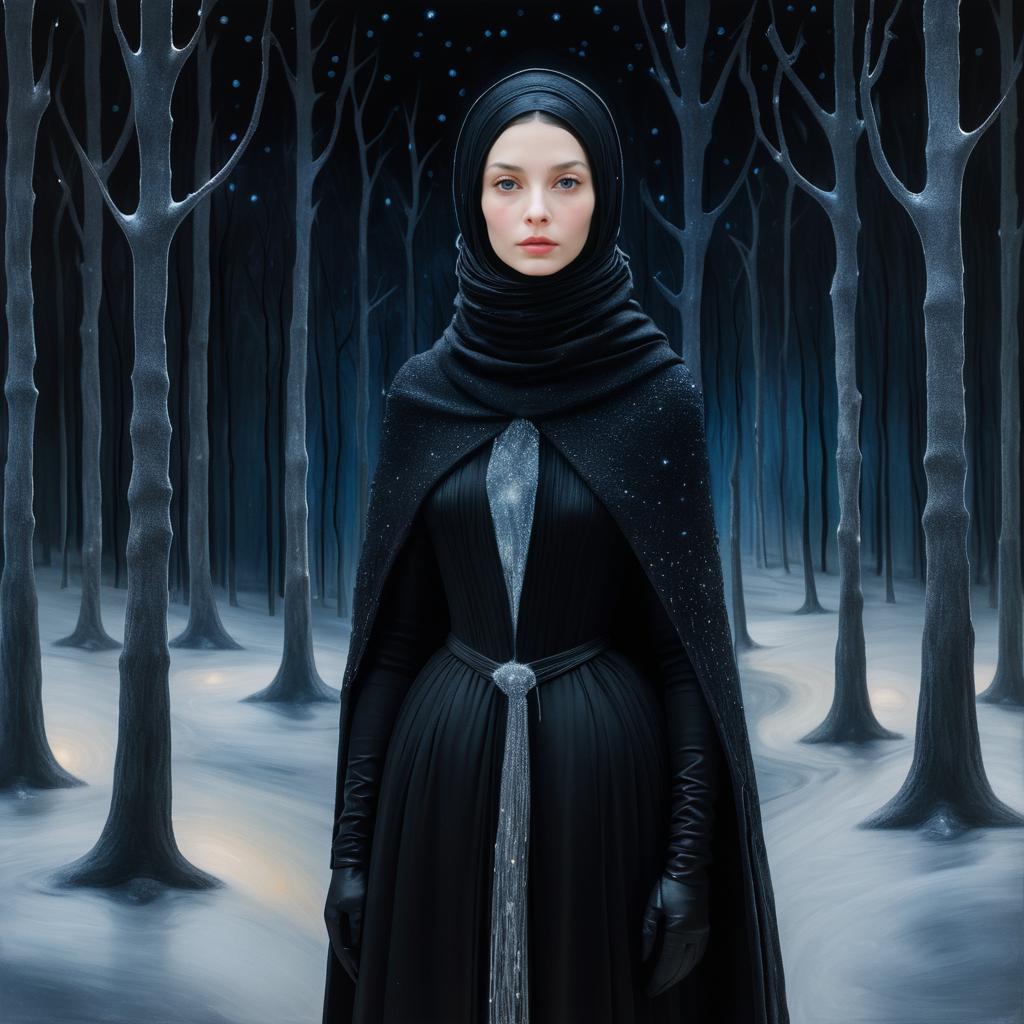 Painting of a woman with ice-textured skin, slim, tall, dressed in black with a scarf around her neck, set in a nighttime forest scene in the style of Hieronymus Bosch.