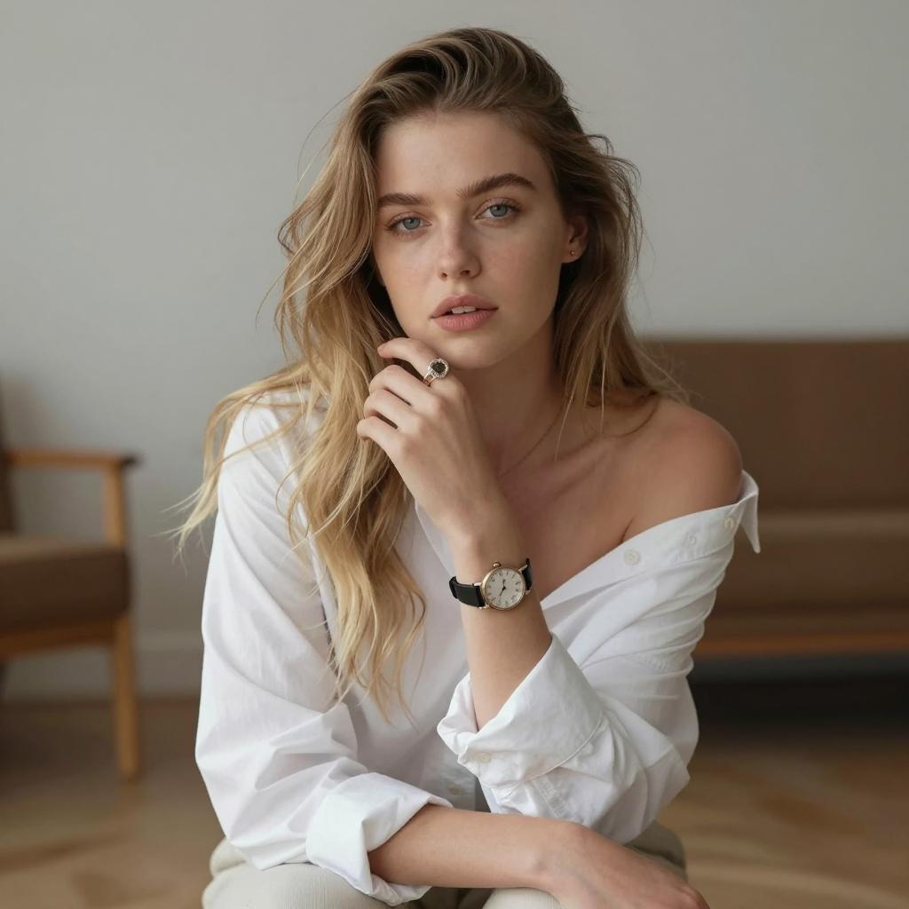 A confident young woman with short blonde hair stands against a graffiti-covered wall in an urban setting, wearing a crisp white button-up shirt with rolled-up sleeves. The photo captures a natural, modern street style with warm lighting that highlights her poised expression and the artistic background.