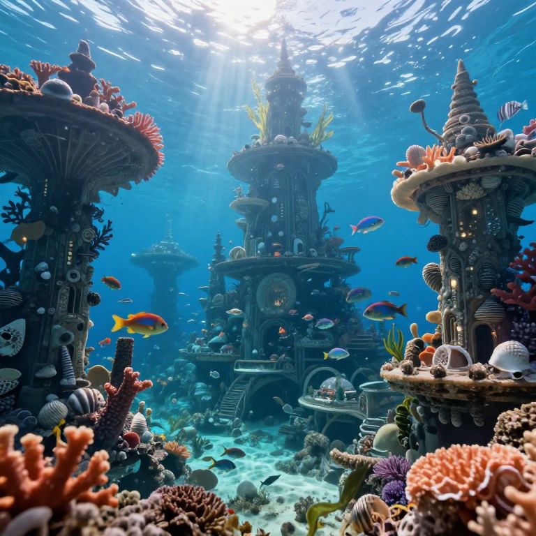 Imagine a surreal underwater cityscape where gravity-defying buildings composed of coral and seashells rise from the depths. From a 'bug's-eye view', observe the bustling aquatic life thriving within this dreamlike metropolis, with schools of iridescent fish swirling around towering structures adorned with barnacles and seaweed. As sunlight filters through the clear blue water, it casts shimmering reflections on the city's surface, creating an enchanting interplay of light and shadow that adds to the mystique and intrigue of this whimsical aquatic utopia.