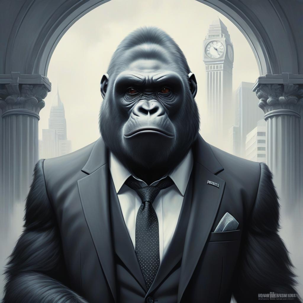 Hyper-realistic lowbrow art painting of a gorilla dressed in a business suit and tie, posed confidently in an urban city street setting. The image is rendered in monochrome colors with fine detail, capturing the gorilla's expressive face and the texture of the suit. Influenced by Tom Bagshaw's hyper-realistic style.