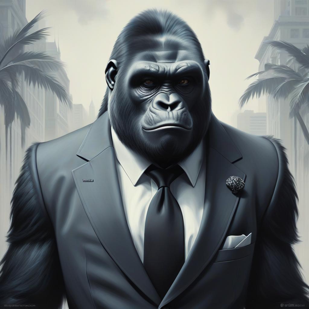 Lowbrow art painting of a gorilla in business fashion style. Rendered in hyper-realism with monochrome colors and influenced by Tom Bagshaw.