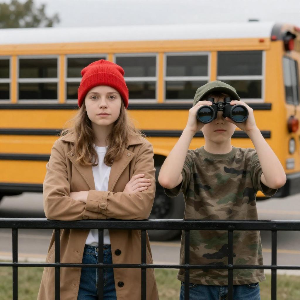 Two children standing behind a black fence in front of a yellow school bus. The girl wears a red hat and brown coat, arms crossed, looking ahead. The boy wears a green hat and camouflage shirt, holding binoculars, looking through them. School bus has black stripes and a number. Overcast lighting.