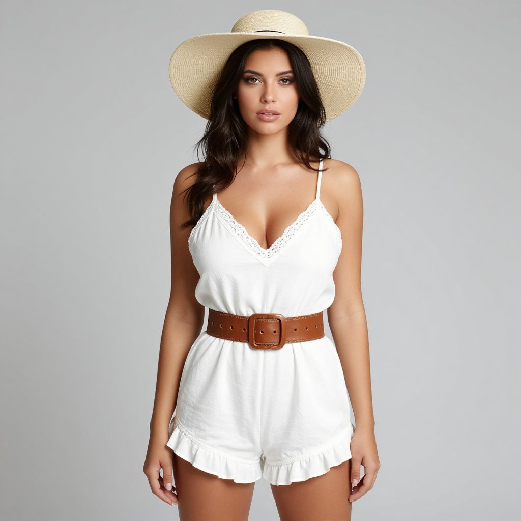 "Woman, casual summer style, short white romper with spaghetti straps, V-neckline with lace trim, cinched at the waist with a wide brown leather belt, ruffled hem, beige wide-brimmed straw hat, grey studio background.. Sexy. Pretty face and beаutiful eyes. Big breasts."