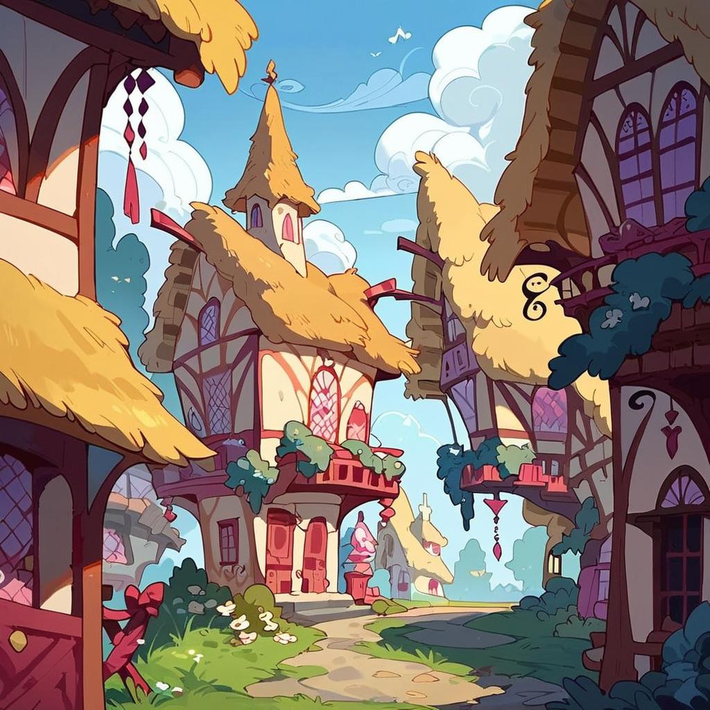 Score_9, score_8_up, score_7_up, score_6_up, score_5_up, score_4_up, source_pony, rating_safe, ponyville, wide angle, scenery porn, equestria, no pony, masterpiece, flat colors, countershading, soft shading