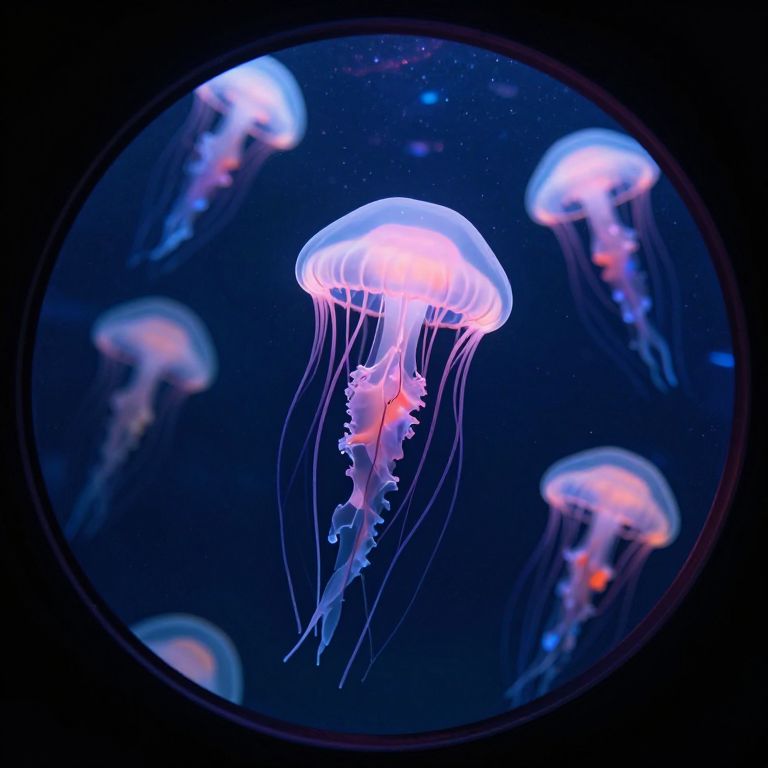 A captivating digital art piece portrays an underwater panorama as seen through the unique perspective of an extraterrestrial being, producing a 'bug's-eye view' effect. Adrift in mid-air are luminous jellyfish, their vivid hues standing out boldly against the shadowy surroundings. This fantastical scene instills feelings of awe and ethereal charm, encapsulating an otherworldly ambiance while departing from conventional marine landscapes to delve into an imaginative aquatic domain.