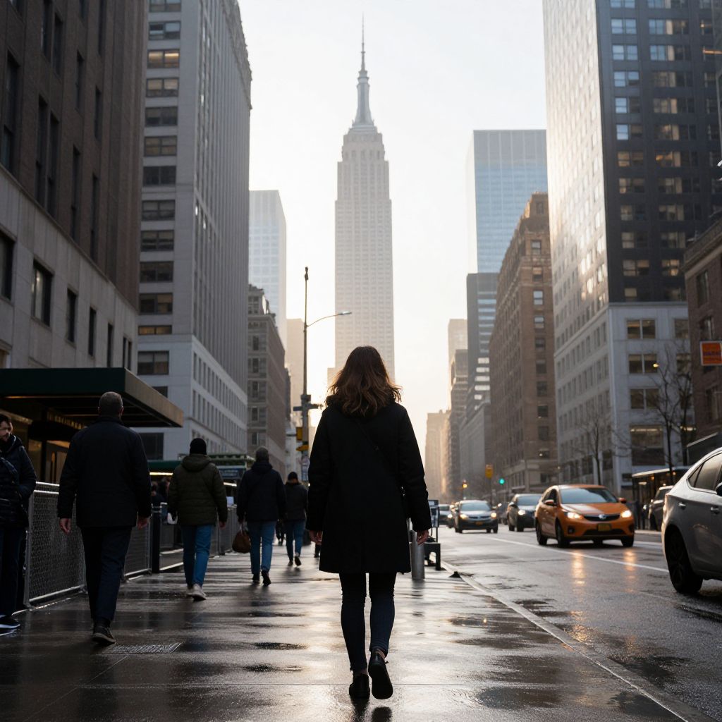 Sunlit cityscape captures a bustling New York morning, featuring a woman in a black coat walking away from the viewer toward a distant Empire State Building, flanked by tall skyscrapers, busy pedestrians, and vehicles navigating the wet streets under a golden haze.