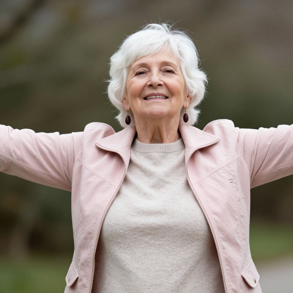 Elderly woman with vibrant white hair and a warm smile stands outdoors, arms outstretched in a gesture of self-compassion and joy, wearing a soft pink jacket over a cozy beige sweater and accessorized with dark earrings.