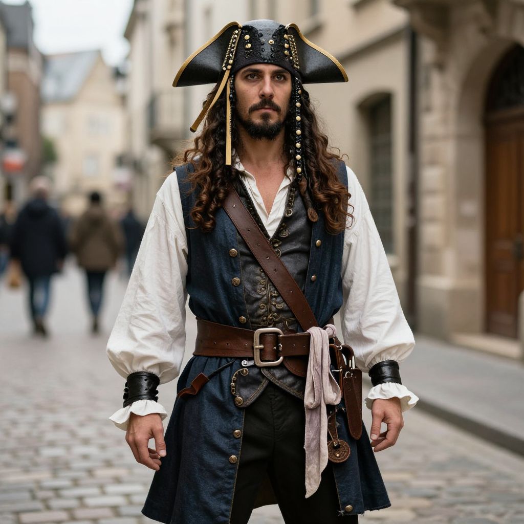 Medieval Pirate Costume, pirate in a pirate costume standing on the street
