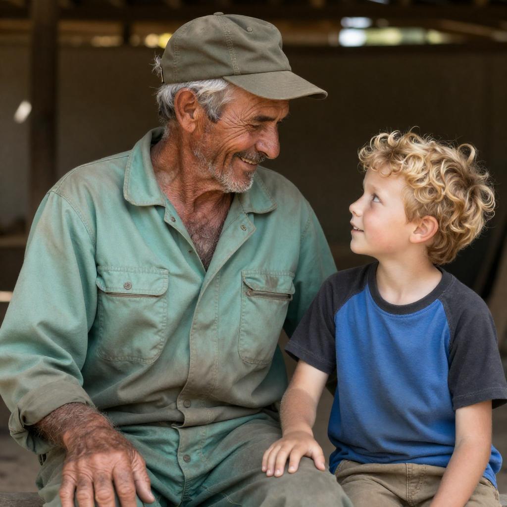 Black-and-white photograph of an elderly man and a young woman sitting together. The man, with a rugged face, wears a worn hat and loose clothes, leaning close to the woman. She has dark hair, large earrings, and a floral dress, smiling up at him. They are seated against a tree, with the man's arm around her. The woman holds a patterned fabric in her lap. The man's expression is gentle and affectionate.