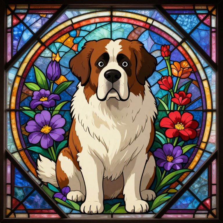 The image presents a highly detailed and vibrant depiction of a St. Bernard dog, rendered in a style reminiscent of Studio Ghibli animation. The dog, with its distinctive white and brown fur, is positioned centrally, surrounded by a rich, colorful floral background that includes purple and red flowers. The scene is framed by a hexagonal stained glass window, featuring intricate geometric filigree in the style of Alphonse Mucha and David Zapora, with a palette of warm and cool colors that add depth and dimension. The lighting is dramatic, with sharp contrasts that highlight the dog's fur and the intricate details of the stained glass. The overall composition is epic, with the dog and flowers arranged in a balanced, symmetrical manner, creating a sense of harmony and beauty. The sharp line work and clear focus on the dog and flowers, combined with the graphic detail and colored geometric filigree, result in a visually stunning and meticulously crafted composite.