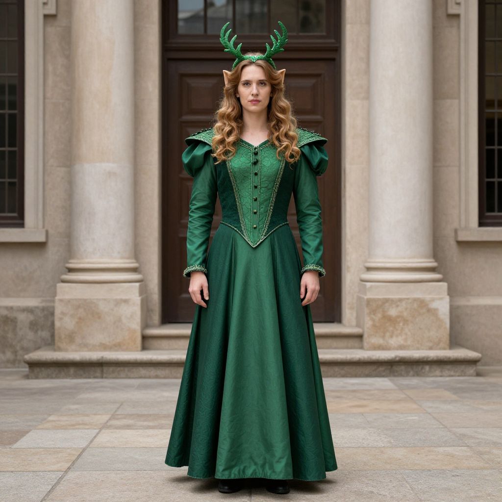 Green Ember Costume, man in green dress standing in front of a building