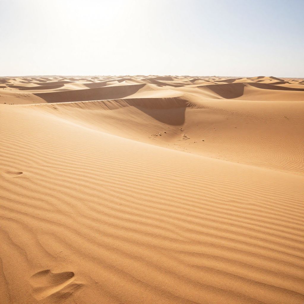 Vast desert landscape featuring towering sand dunes under a bright, sunlit sky. The golden sand is finely textured with ripples and footprints, showcasing the heat and dryness of the environment. The horizon stretches far, emphasizing the expansive and arid nature of the desert.