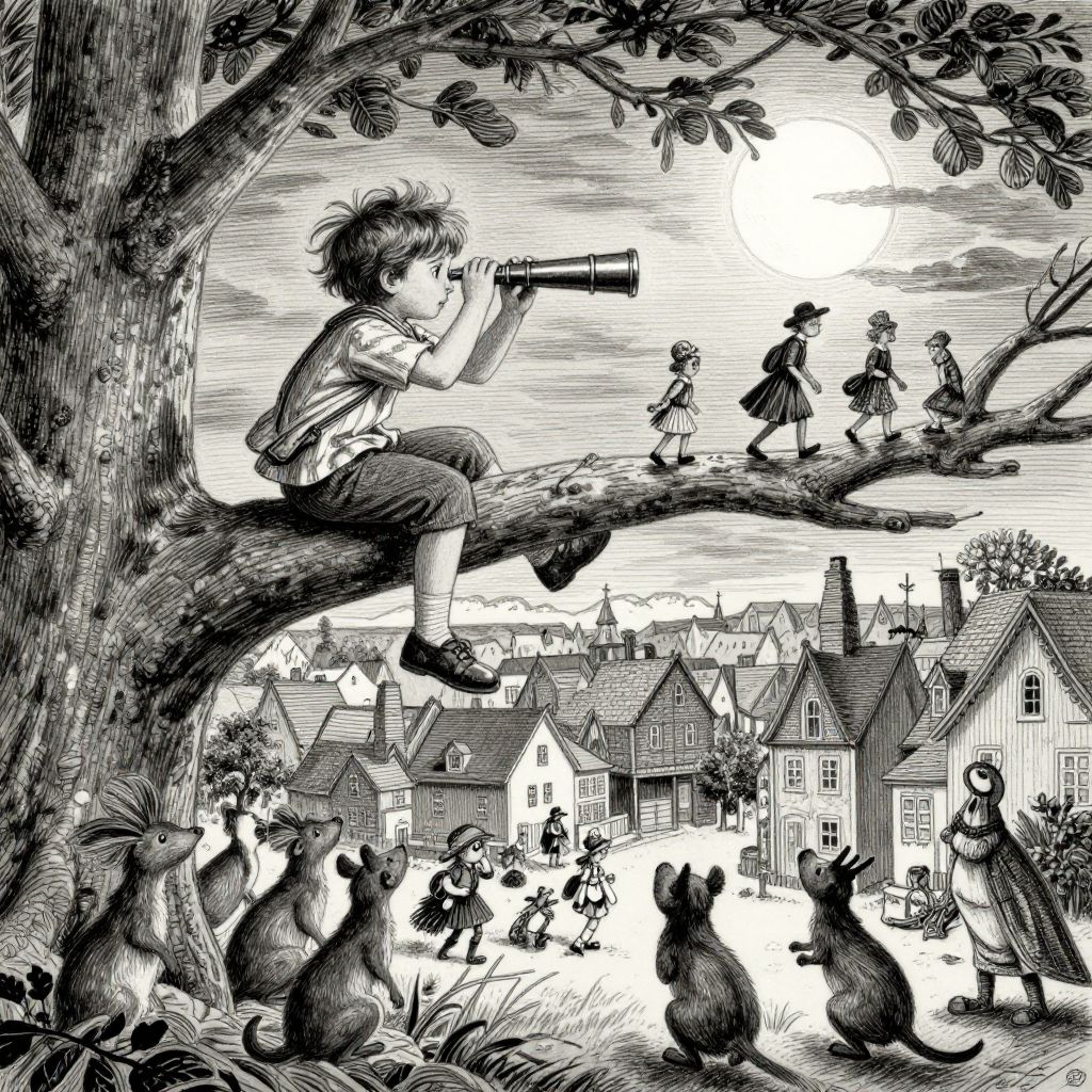 A curious child perches on an expansive tree limb swaying in the wind, gazing through a mystical telescope at miniature figures moving about in a quaint Victorian town below. The artwork is reminiscent of Edward Gorey's intricate pen-and-ink illustrations, with its haunting and surreal atmosphere illuminated by an enigmatic moon hanging above the horizon. As he fine-tunes the antique brass lens, the boy unwittingly summons a lively assortment of woodland creatures who gather around him, their inquisitive gazes mirroring a shared sense of astonishment and fascination at this captivating convergence of reality and imagination.