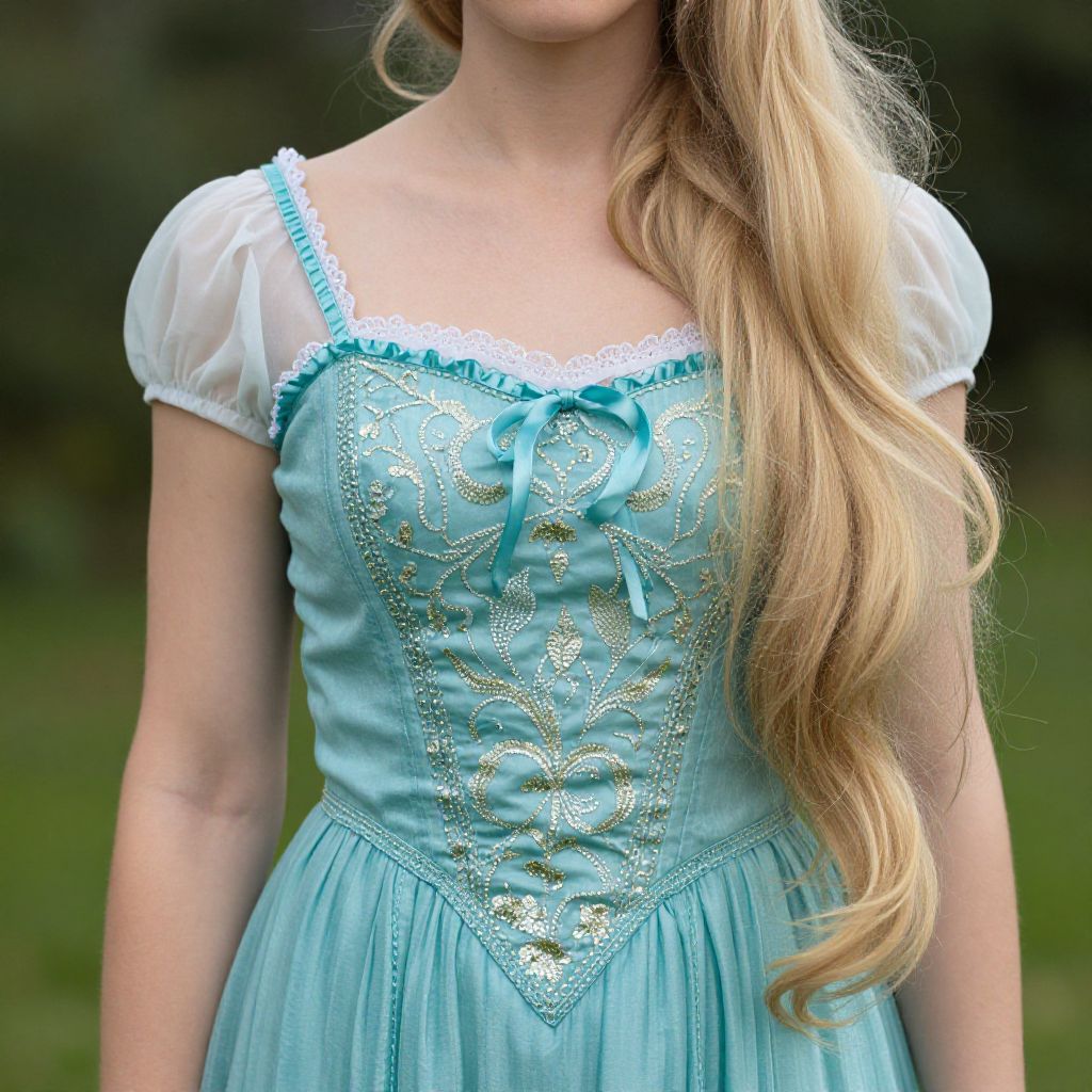 "Tangled Rapunzel Dress, a close up of a woman with long blonde hair wearing a dress"