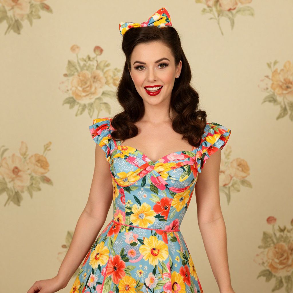 A woman in a vibrant retro-style floral dress exudes a classic 1950s rockabilly charm, featuring a sweetheart neckline and ruffled sleeves, complemented by a matching hair bow against a soft, vintage-inspired floral backdrop.