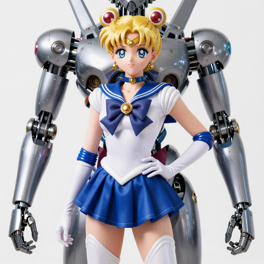 This digital anime-style artwork features a blonde, blue-eyed, young woman dressed as Sailor Moon, a popular magical girl character. She wears a white sailor uniform with a blue collar and bow, a short blue skirt, white gloves, and white thigh-high boots. Her hair is styled in two buns with red and white hair accessories. Behind her stands a large, metallic, humanoid robot with intricate mechanical details and jointed arms. The background is plain white, making the characters stand out. The robot's metallic texture contrasts with Sailor Moon's vibrant, colorful outfit, adding a futuristic element to the classic anime character.