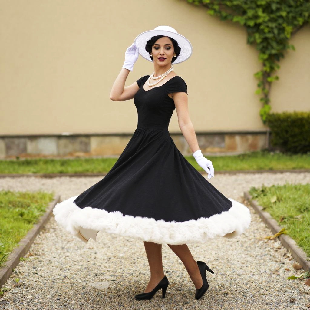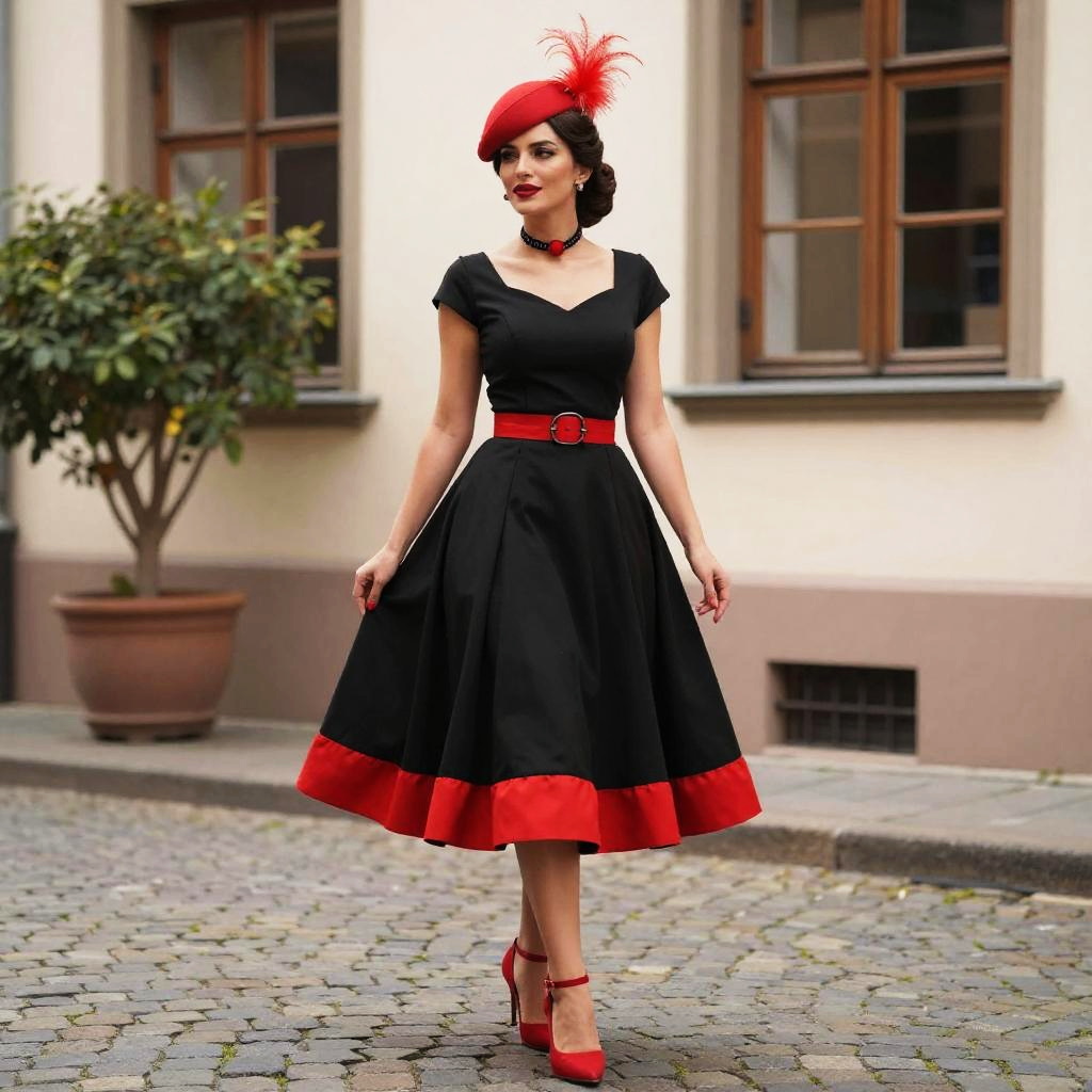 Photograph of a woman in a vintage-style black dress with a bright red underskirt and red accents. She's wearing red high heels and a matching red hat with a red feather. Her dark brown hair is styled in an elegant updo. She's posing outdoors on a cobblestone street with a historic building in the background, featuring wooden window frames and greenery.