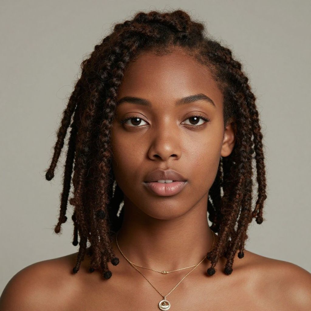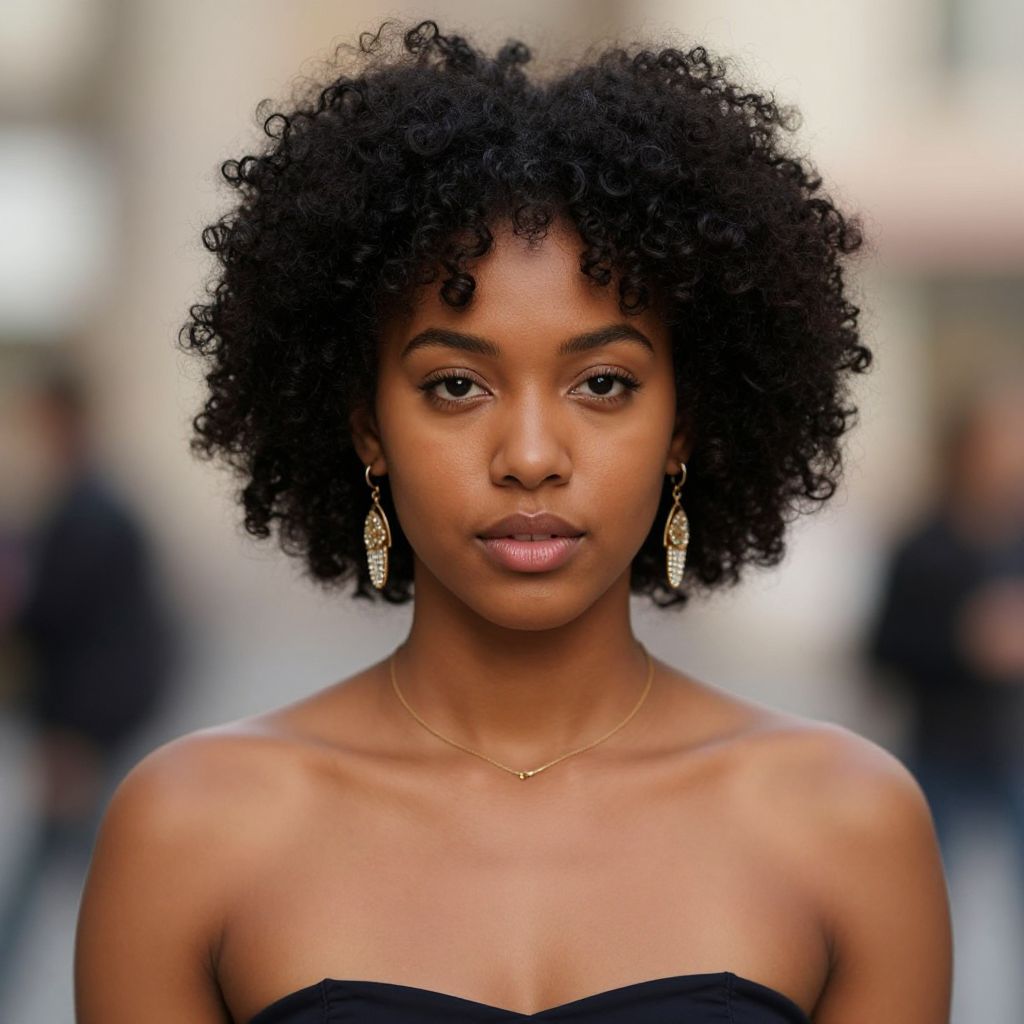 Photograph of a young Black woman with a medium-brown complexion and natural, voluminous curly black hair. She has full lips with a subtle gloss and is wearing large silver hoop earrings and a gold chain choker necklace. Her expression is neutral, with a direct gaze at the camera. She is topless, showcasing her bare shoulders. The background is a plain, bright white, highlighting her features and accessories. The lighting is even, emphasizing her smooth skin texture and the details of her hair and jewelry. The image has a modern, minimalist style.