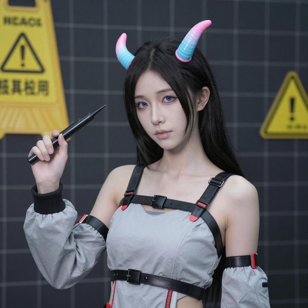 Photograph of an Asian woman with pale skin and black hair, wearing a light gray, futuristic outfit with black straps and red accents. She has pink and blue horn-like headpieces and is holding a black object in her right hand. The background features a black tiled wall and a yellow caution sign.