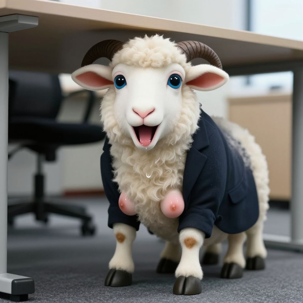(8k, hd, realistic, photo realistic, vibrant, crisp, sharp details, soft lighting, Highly detailed, best quality, masterpiece, detailed eyes:1.3) (office, under the desk, loose dress suit, on hands and knees under a desk:1.3) (anthro sheep:1.4) (open mouth, drooling, breasts:1.3)