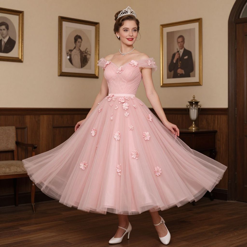 A woman elegantly poses in a vintage 1950s prom dress style, featuring a soft pink tulle gown with delicate floral embellishments and a sweetheart neckline, complemented by a tiara and white heels, set against a classic interior with warm lighting and framed artwork, evoking a timeless, high-definition retro aesthetic.