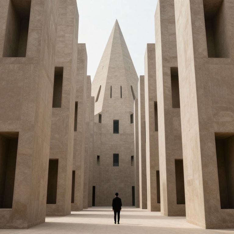 A solitary figure stands before an endless array of towering, monolithic structures that rise like inverted pyramids, their symmetrical voids creating a hypnotic, dreamlike corridor that defies conventional architectural logic.