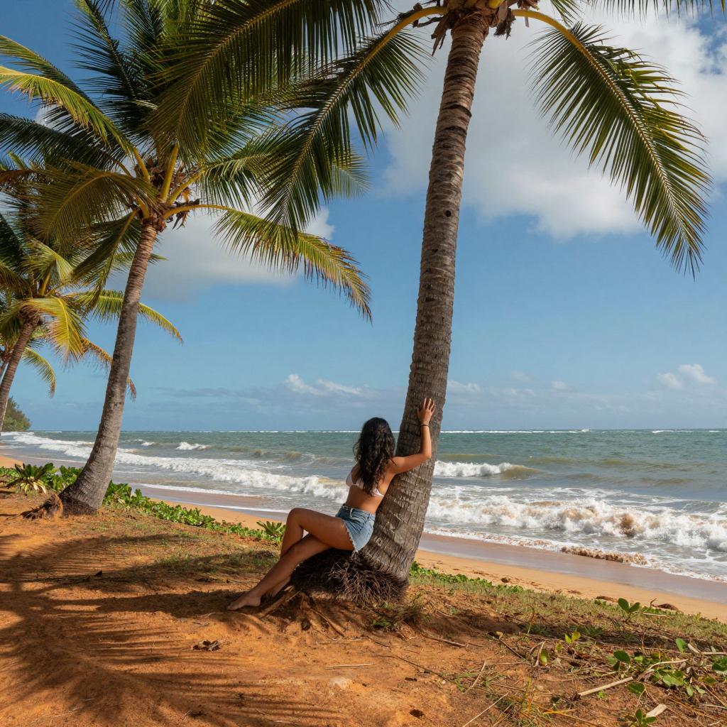 A woman sitting and leaning against a palm tree on a small hill overlooking an ocean with gentle waves, surrounded by tall palm trees, bright blue sky with scattered clouds, warm orange-brown soil, tropical beach setting, vibrant tropical natural scenery with detailed textures and warm color tones