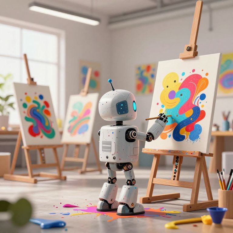 Ai generator craiyon rendering a whimsical scene of robots sketching colorful abstract art on canvases in a bright, imaginative studio filled with floating paint splashes and dynamic lighting effects