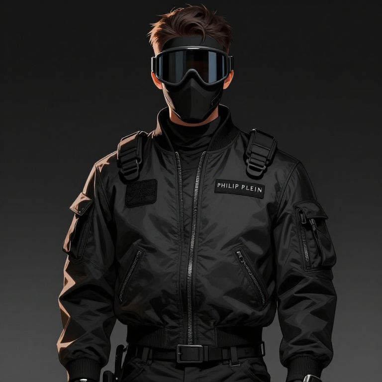 Backwash thick acrylic illustration, waist up portrait, gorgeous high fashion boy, tacticalwear, bomber jacket, goggles, mask, dark background, Phillip Plein, best quality, ultra detailed, on pixiv,
