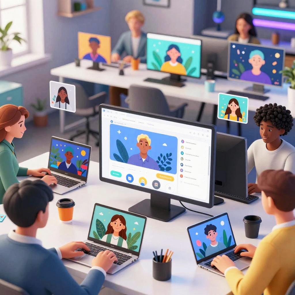 Getimg.ai review themed digital art portraying users interacting with AI image tools on multiple devices, diverse people collaborating on creative visual projects enhanced by getimg.ai, vibrant workspace filled with floating AI-generated image thumbnails, dynamic futuristic atmosphere