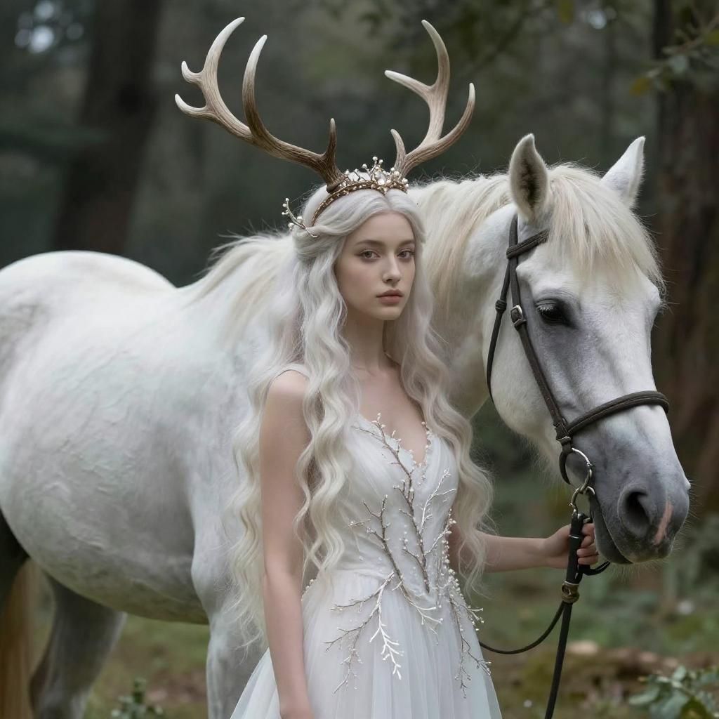 Portrait of a fantasy-themed woman with long wavy platinum blonde hair, wearing an ethereal white dress adorned with delicate branch-like embellishments. She wears a striking crown resembling deer antlers and stands beside a white horse in a softly lit, mystical forest setting.