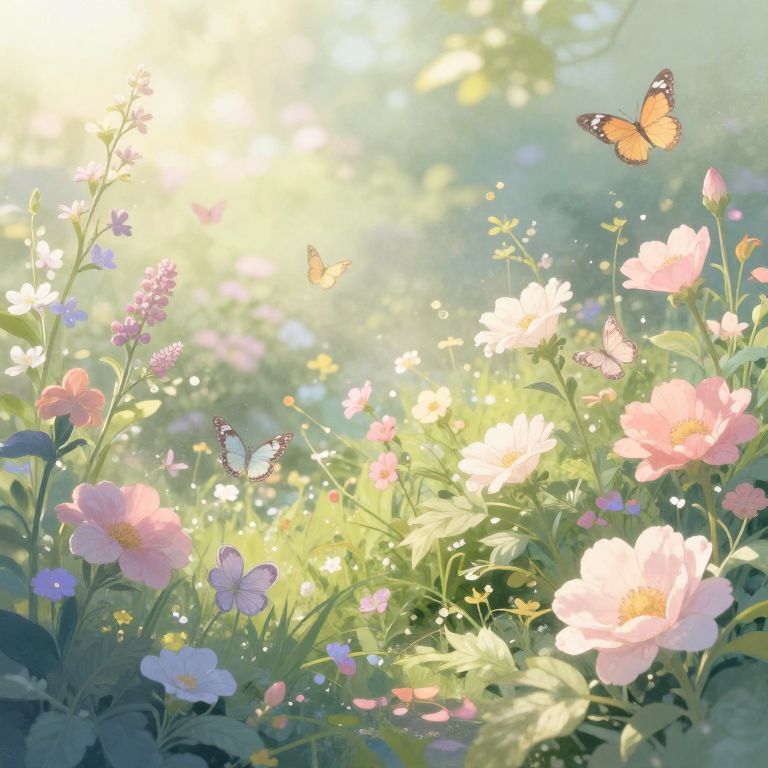 Fantasy garden bathed in soft pastle sunlight, with pastel-toned flowers, butterflies, and lush foliage, detailed botanical illustration style with an ethereal touch, incorporating misty effects and light reflections to enhance the calming mood.