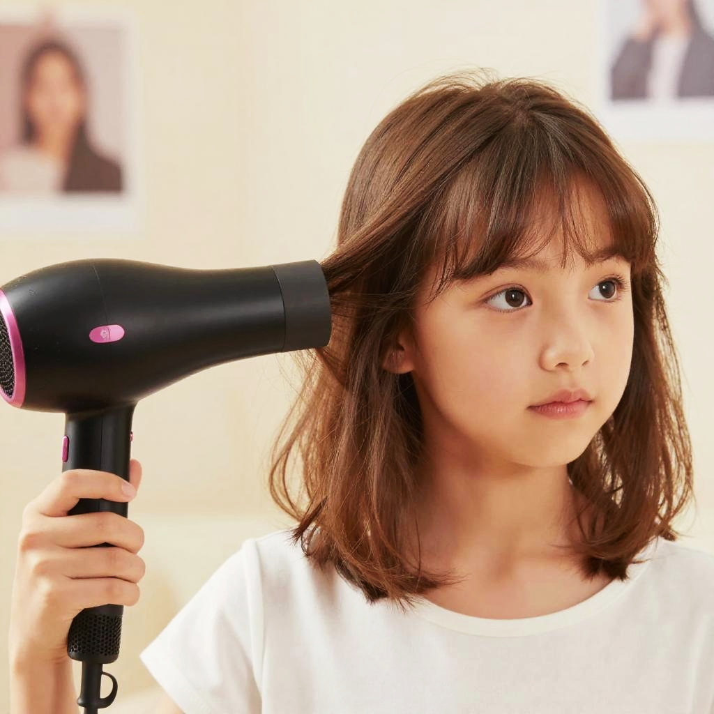 A young girl with light skin and brown eyes is having her hair washed at a salon. She is reclining in a black salon chair with a black cape covering her, featuring a beige collar. A hand is gently massaging her wet, slicked-back hair over a white sink with water dripping. The background is a warm, neutral-colored wall. The girl looks relaxed and slightly smiling during the hair wash.
