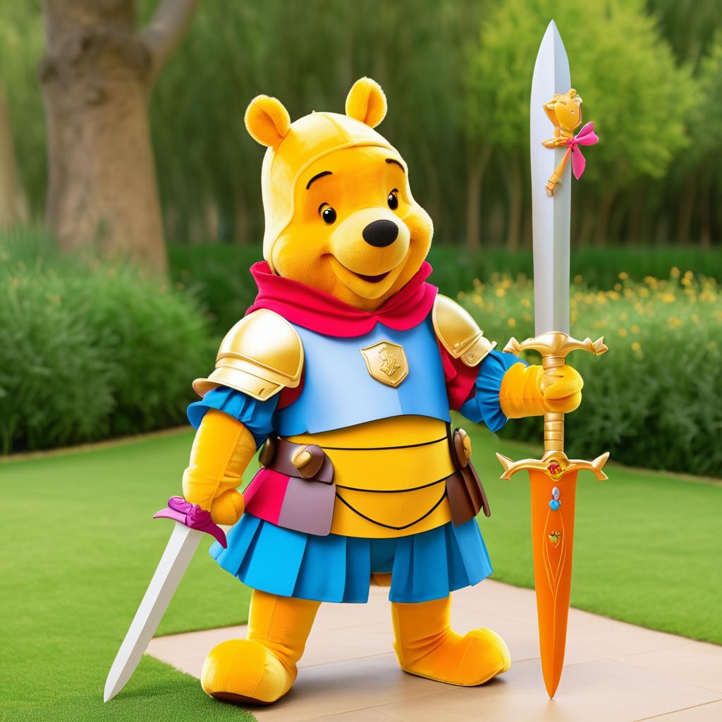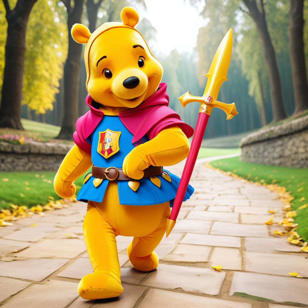 Winnie the Pooh dressed as a knight, styled in a playful and vibrant fashion.