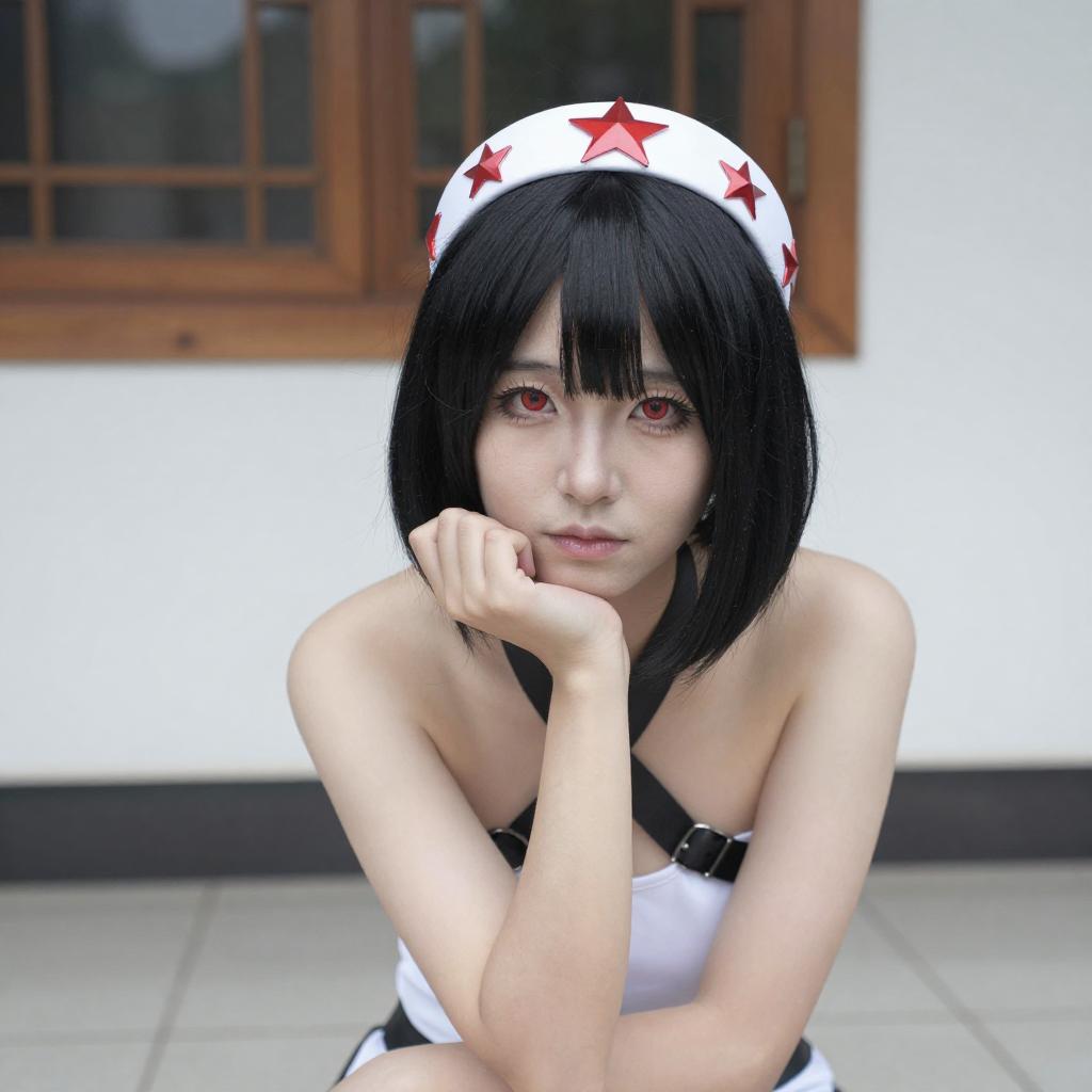 Photograph of a pale-skinned woman with black hair, red eyes, and a white and red geometric headpiece, kneeling on a white tiled floor. She wears a black strappy top, exposing her shoulders and cleavage. A wooden-framed window with a circular design is in the background. She looks directly at the camera with a slight smile.