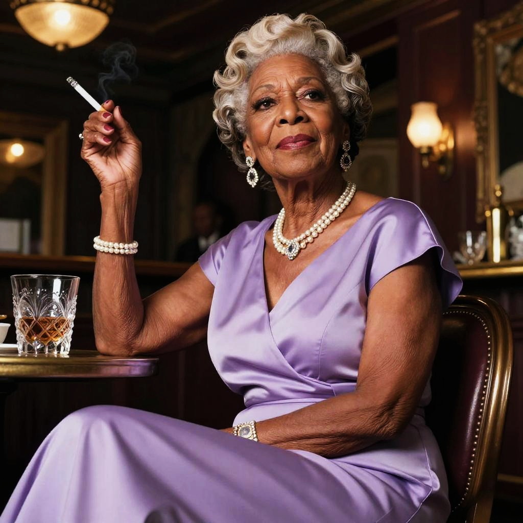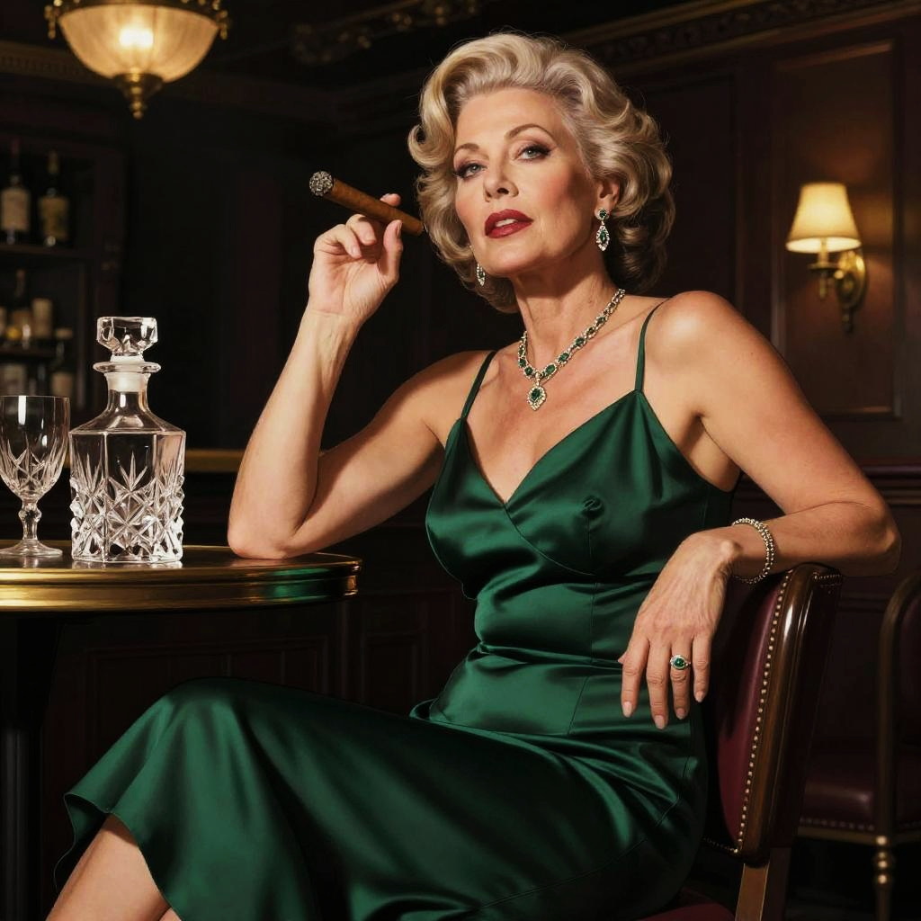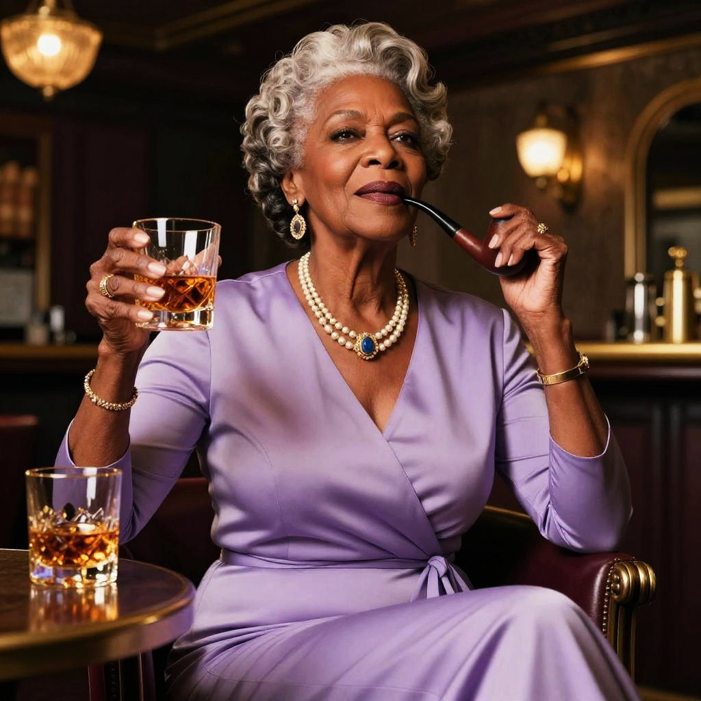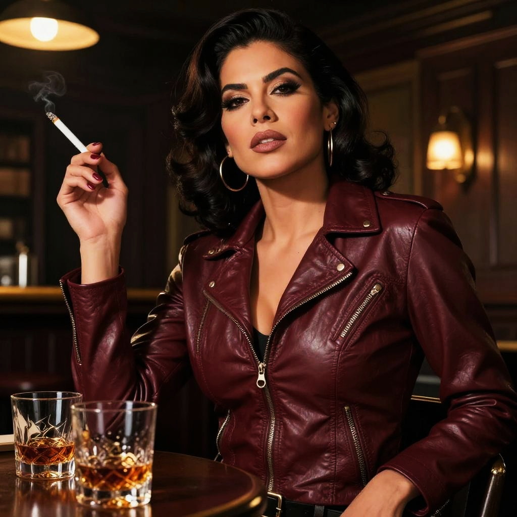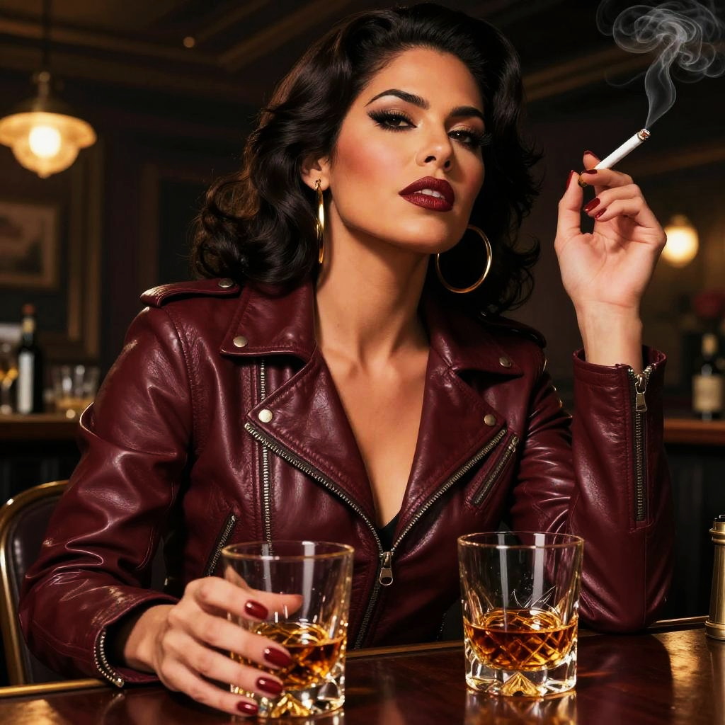 Highly detailed scene in the style of Greg Capullo, showing youthful mixed-race woman in her mid-20s in a sleek navy satin dress, sitting at a pub with luxury whiskey glasses and a cigarette, low angle dramatic shot, hyper-detailed and elegant, cinematic pub ambiance.