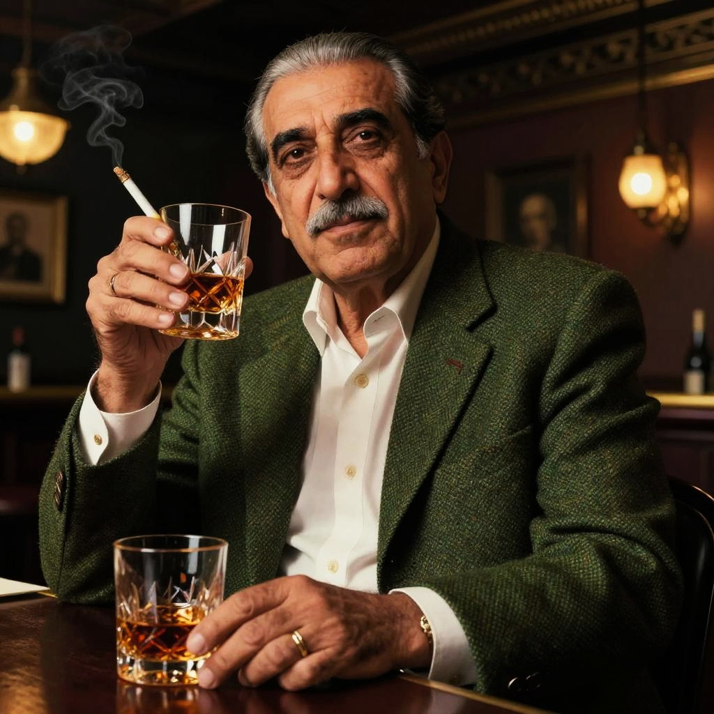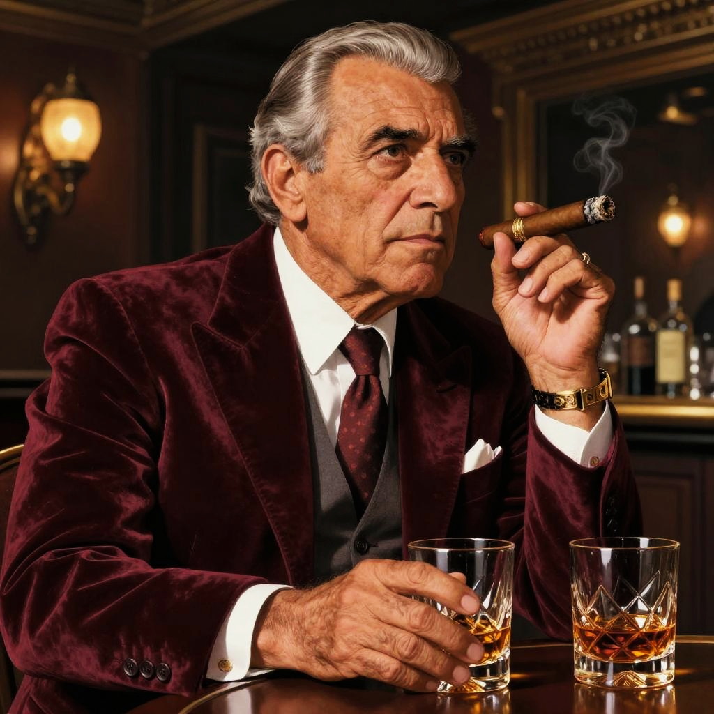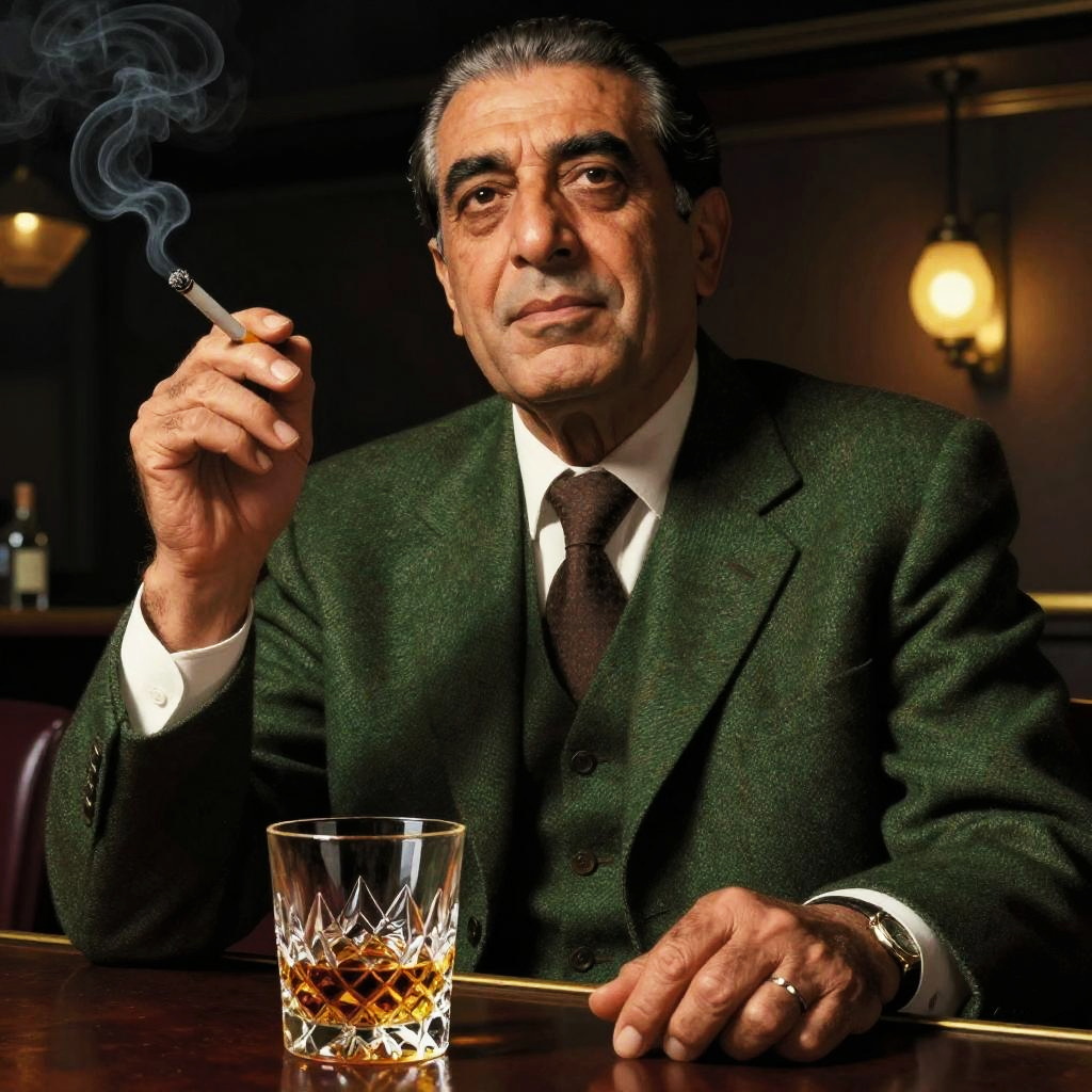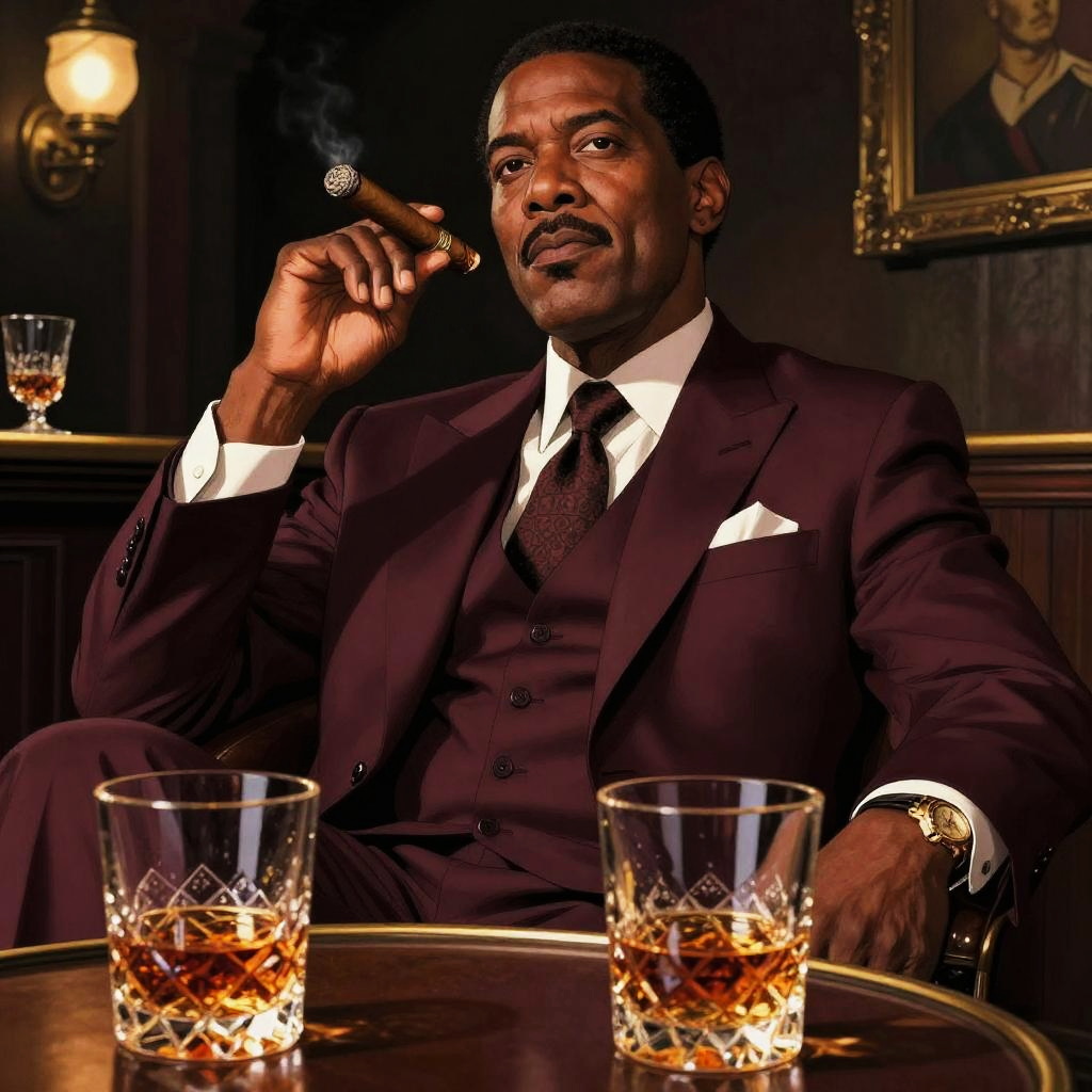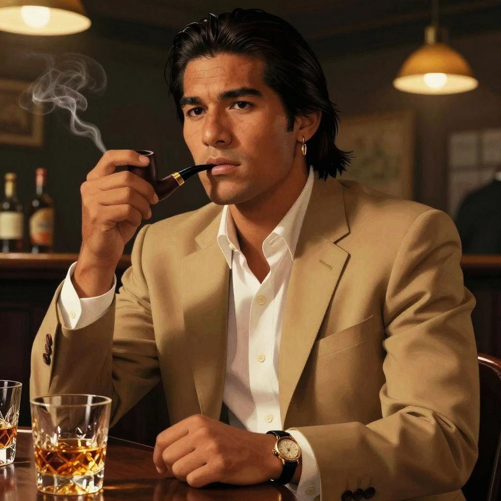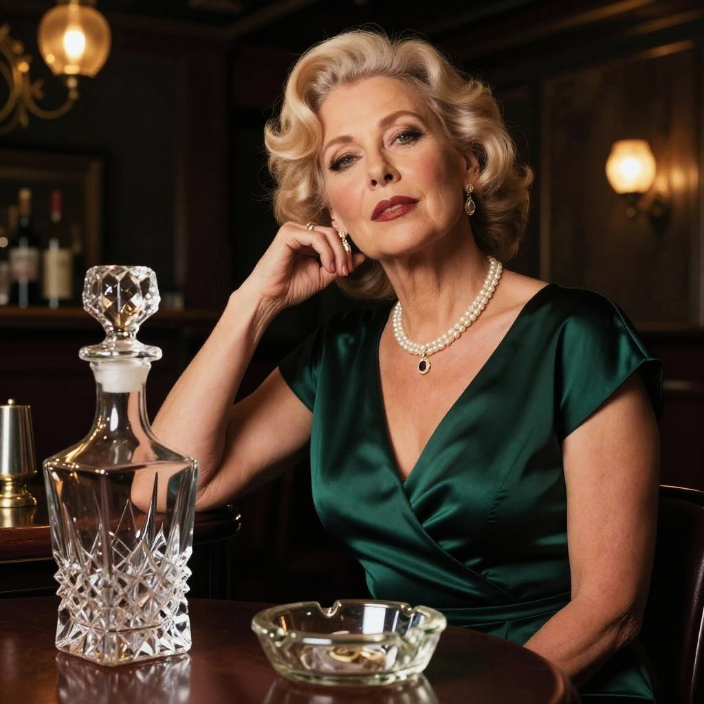 Highly detailed scene in the style of Greg Capullo, showing youthful mixed-race woman in her mid-20s in a sleek navy satin dress, sitting at a pub with luxury whiskey glasses and a cigarette, low angle dramatic shot, hyper-detailed and elegant, cinematic pub ambiance.
