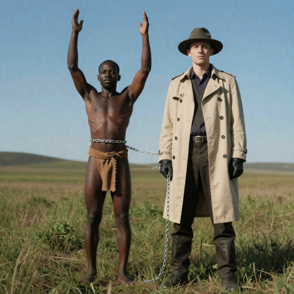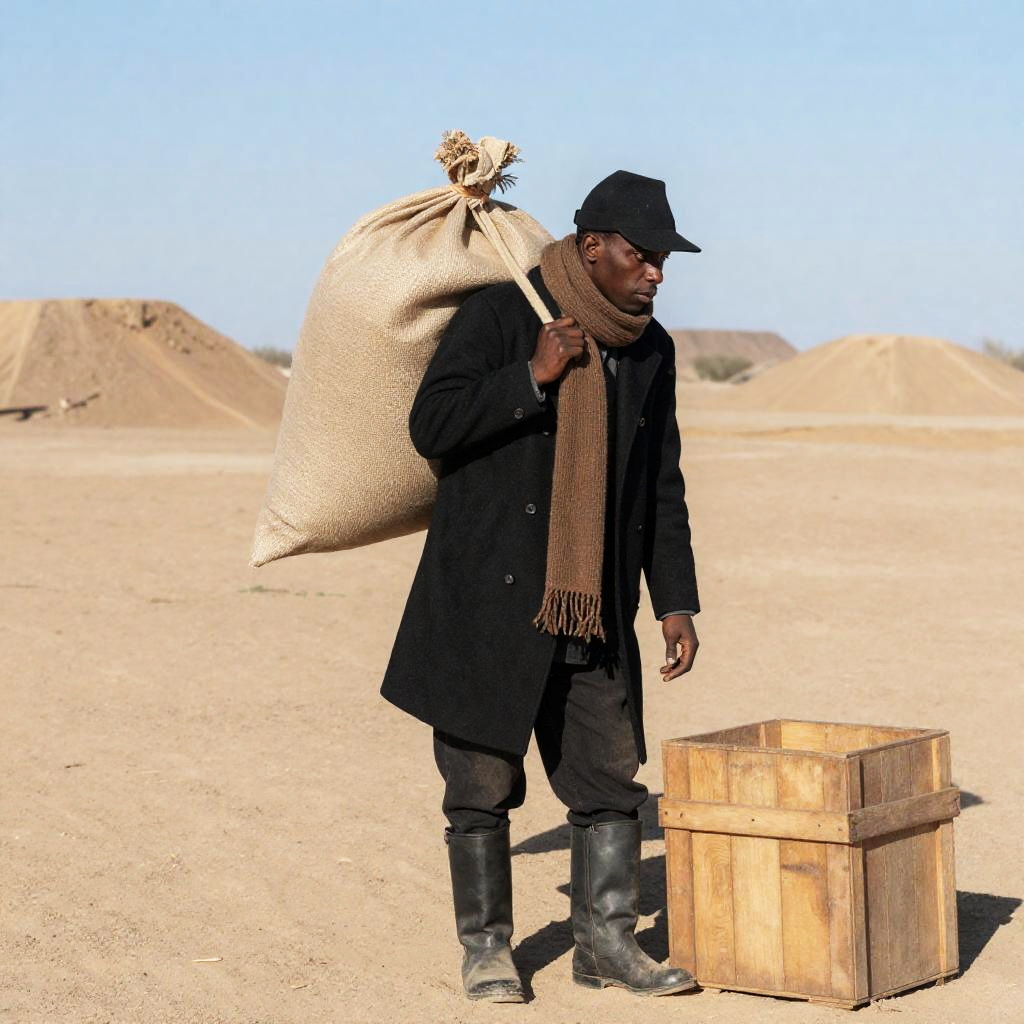 Man with dark skin, black coat, gray boots, black hat, and brown scarf stands on dry, sandy terrain. He carries a large sack on his back and stands beside a wooden crate. Background includes dirt mounds and clear blue sky.