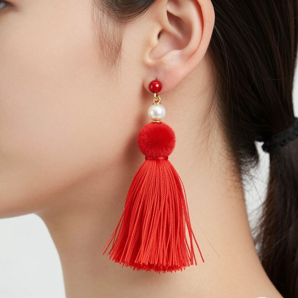 Close-up of a woman's ear showcasing vibrant red mini tassel earrings featuring a spherical pom-pom, a small gold ring, and a cascading fringe of red threads, complemented by a pearl and a red bead above the tassel.