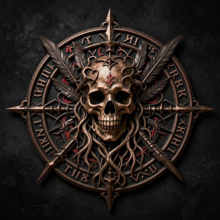 The image presents a highly detailed and realistic depiction of a post-apocalyptic Slavic god symbol, set against a dark, textured black background. The emblem is intricately designed with a central skull adorned with long, intertwined roots or vines, giving it a sinister and organic appearance. Surrounding the skull are elaborate, ornate designs that include feathers, runes, and other mythological elements, all rendered in a metallic, bronze-like texture that adds to the dystopian atmosphere. The emblem is framed by a circular border with additional intricate patterns and symbols, including red accents that contrast sharply with the dark background. The overall composition is symmetrical, with the skull and surrounding elements arranged in a balanced, harmonious manner, creating a sense of depth and complexity. The image exudes a sense of ancient power and mystique, evoking a sense of the past and the future intertwined in a single, ominous symbol.