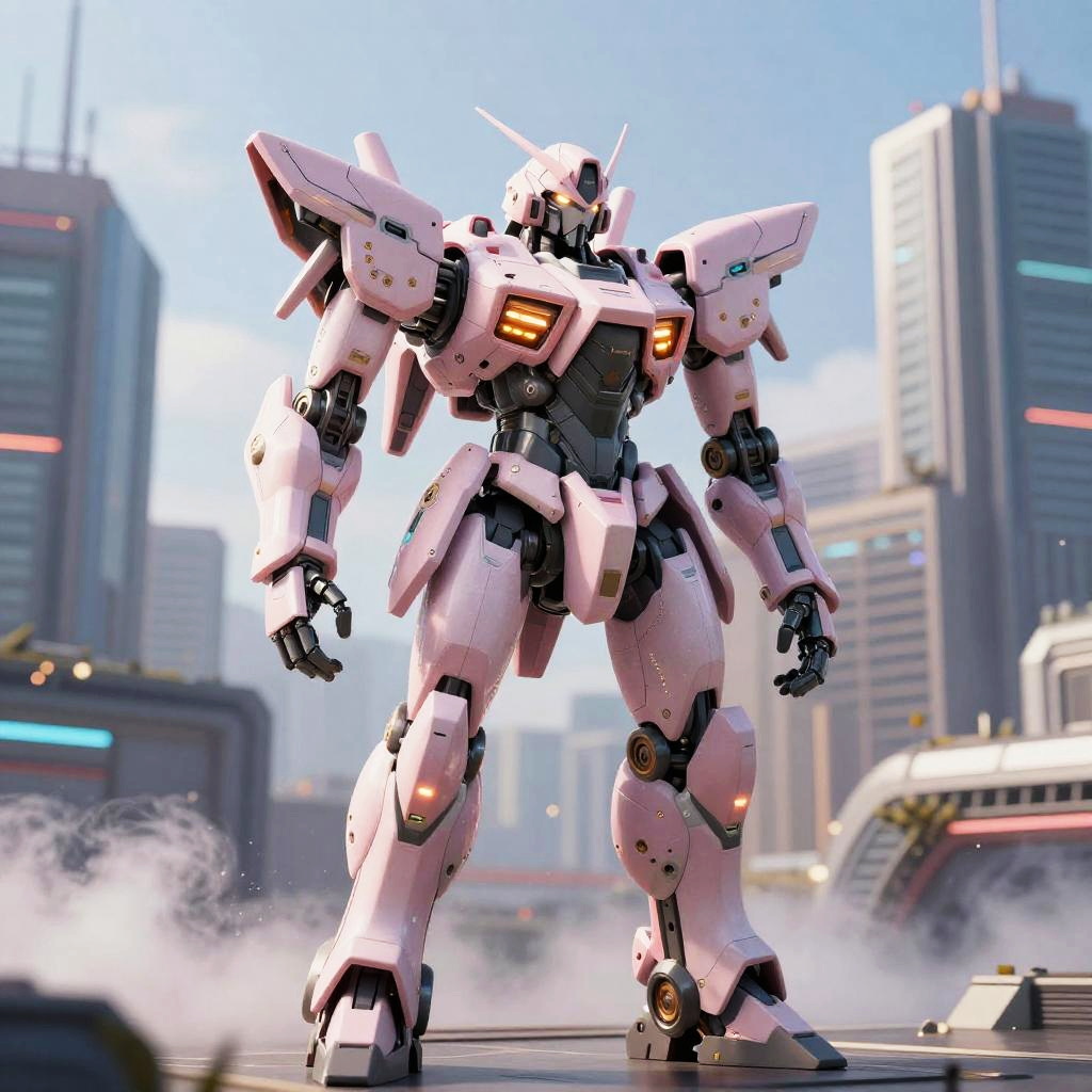 Cloud, holding_weapon, no_humans, glowing, robot, building, glowing_eyes, mecha, science_fiction, city, realistic, light pink mecha