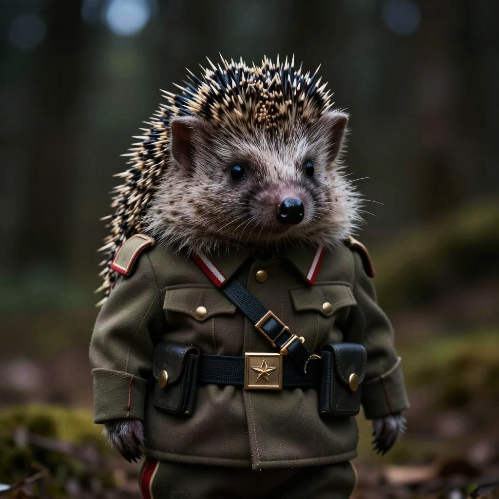 Nazi hedgehog in a detailed uniform, standing in a dark forest background, with a stern expression, dramatic lighting, cinematic style, highly detailed fur and military outfit