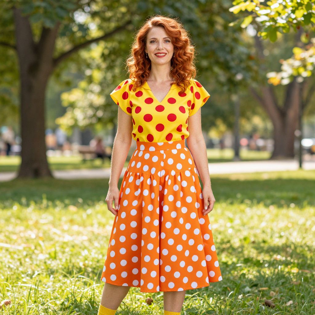 A bright photograph of a smiling woman with curly red hair, standing in a sunlit park. She's wearing a yellow blouse with large red polka dots and an orange skirt with white polka dots. She's also got yellow socks and stands on green grass with trees and sunlight in the background. The overall vibe is cheerful and playful.