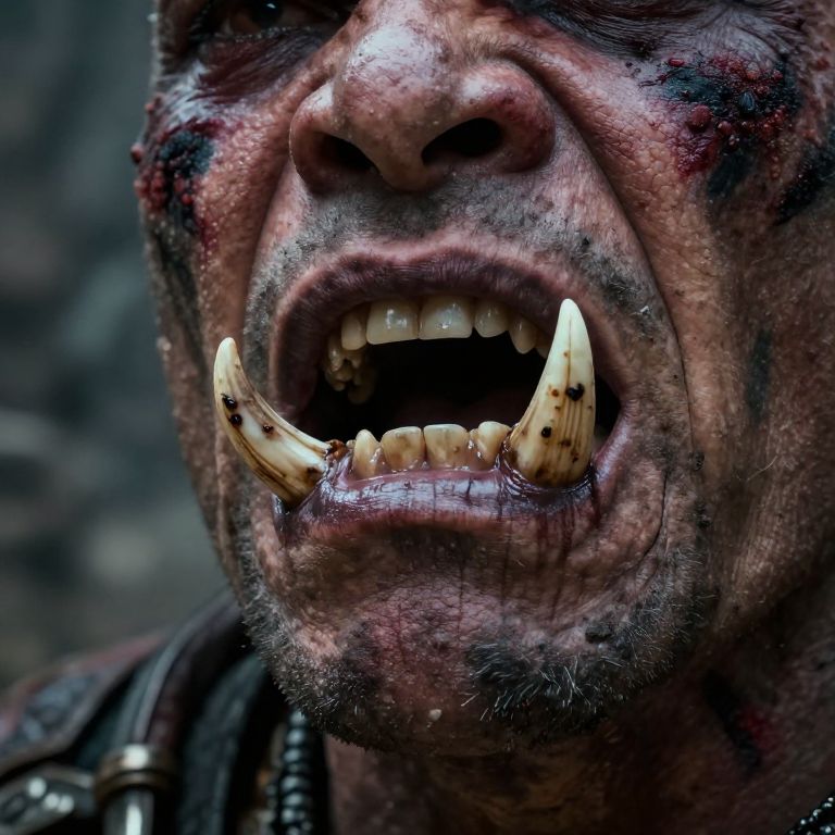Photograph of a close-up of a man's face with exaggerated, grotesque features. His mouth is wide open, revealing large, sharp, yellowed tusks with black spots. His skin is rough, with visible dirt and blood smears, and his beard is patchy. His eyes are partially visible, with dark, smudged makeup around them. He is wearing a dark, leather-like garment with metallic accents. The background is blurred, with dark, muted colors, focusing attention on the man's intense, monstrous expression. The image has a high-contrast, dramatic style, emphasizing the eerie and barbaric appearance.