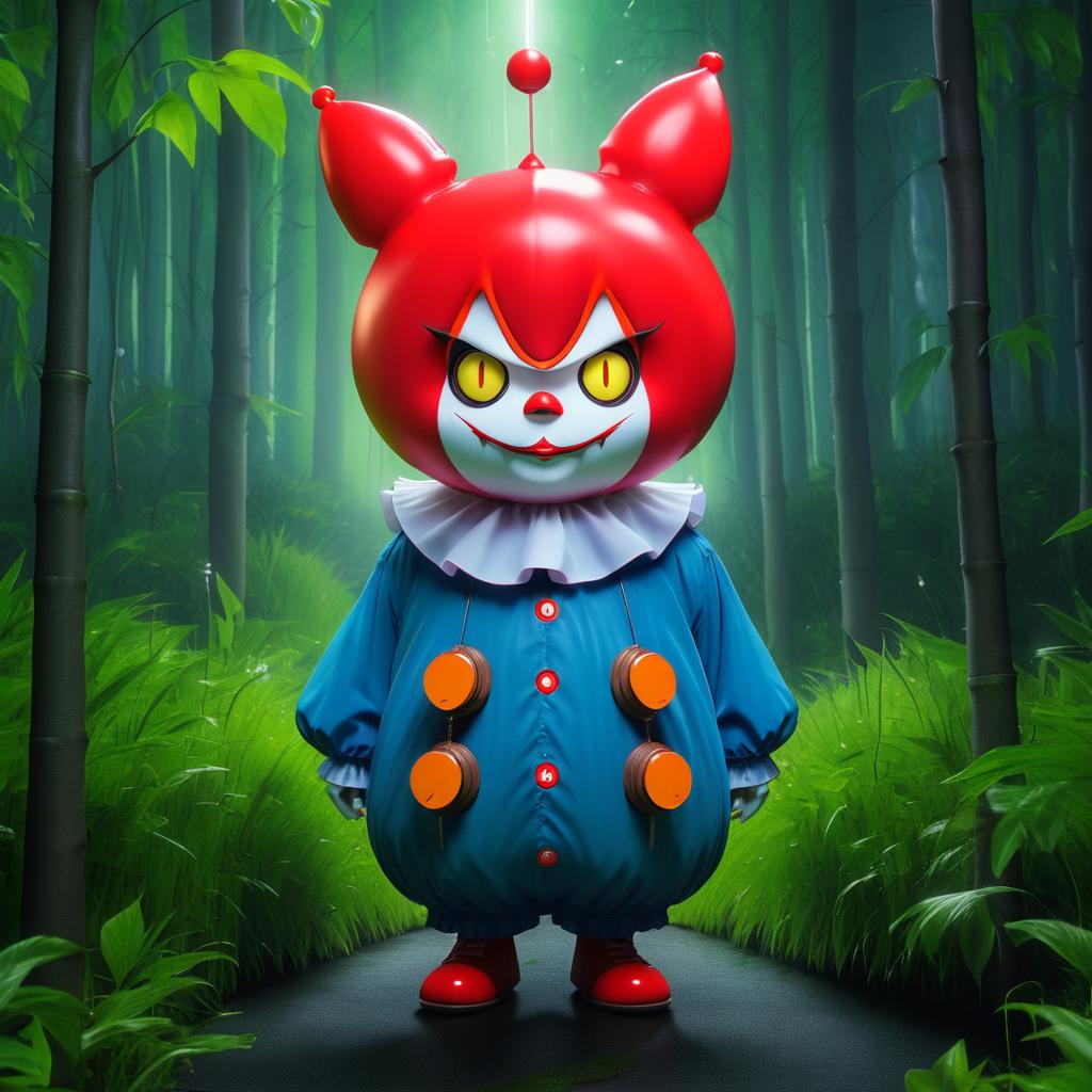 A vibrant and high-quality digital illustration featuring Pennywise the clown stylized as a character from My Neighbor Totoro. The figure has a large round head with red hair, yellow eyes, and a menacing look, dressed in a blue outfit with red ruffled collar and red shoes. The character is standing in a lush green forest with a small toadstool-like creature nearby.