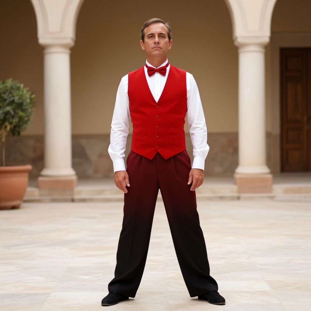 Tango Costume Male, man in a red vest and bow tie standing in a courtyard