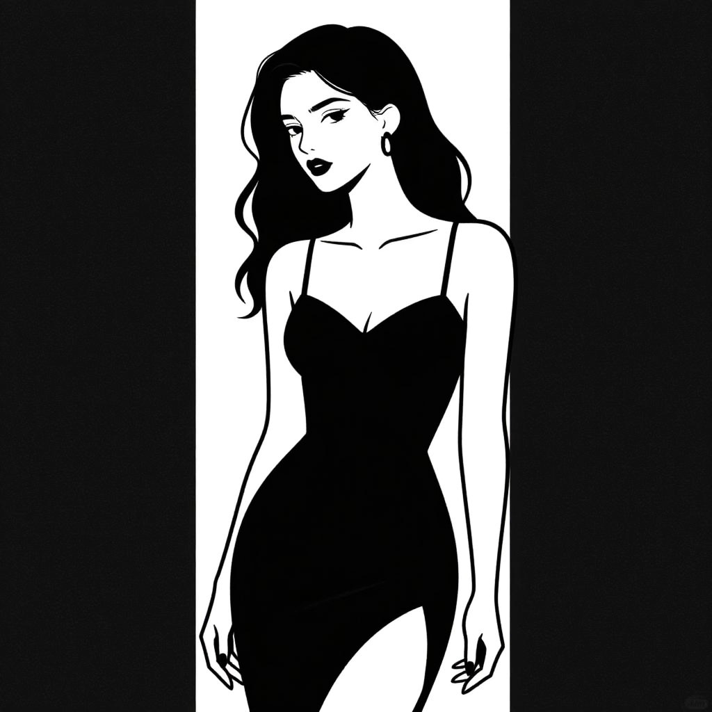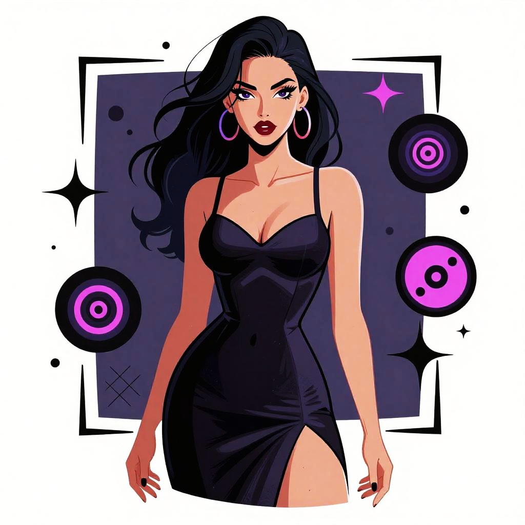 Digital illustration of a confident woman with long black hair and blue eyes wearing a dark, form-fitting dress. She has gold hoop earrings and stands against a vibrant background featuring pastel and neon colored circular shapes and star-like sparkles, blending Futurism and Vaporwave aesthetics.