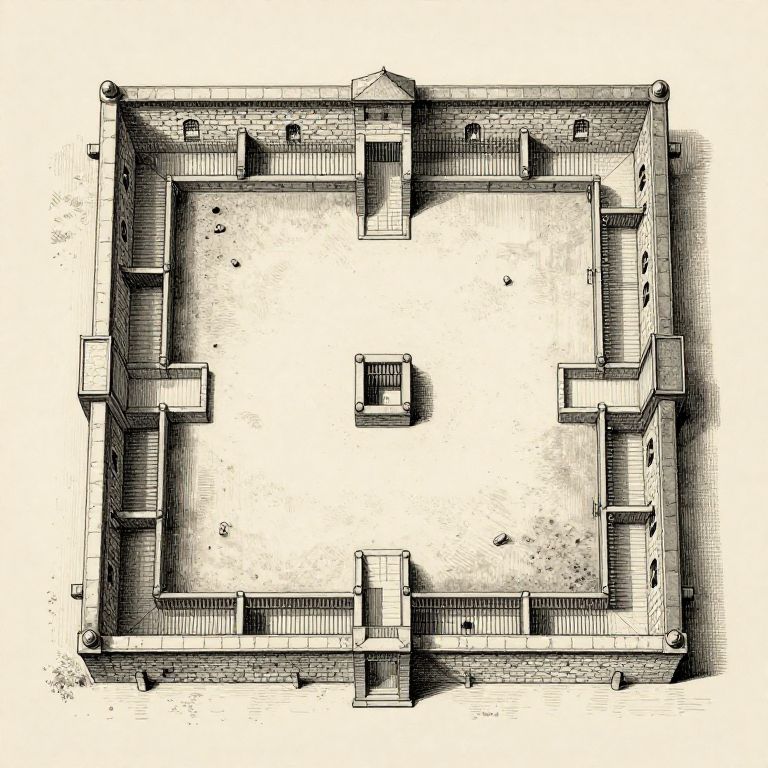 Prison floor plans vintage style, 19th-century penitentiary architecture, stone walls, barred cells, isolated yards, narrow hallways, hand-drawn sketch, sepia tones